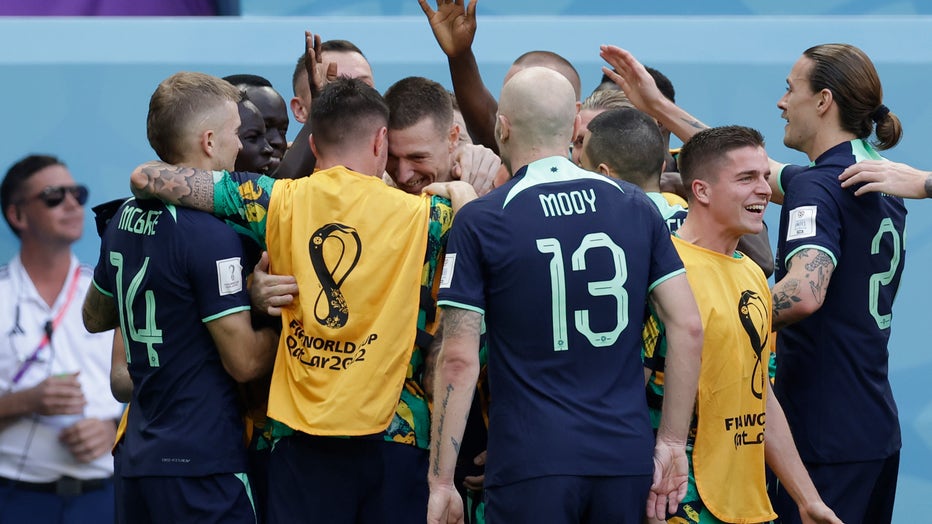 Mitch Duke #15 of Australia celebrates with team mates after scoring his team's first goal during the FIFA World Cup Qatar 2022 Group D match between Tunisia and Australia at Al Janoub Stadium on November 26, 2022 in Al Wakrah, Qatar. (Photo by Liu L