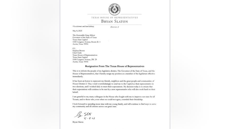 Slaton, a married father who portrayed himself as a "family values" conservative, submitted his written resignation to Gov. Greg Abbott on Monday. In the letter, Slaton said he planned to spend more time with his family but did not address the inappropriate conduct.