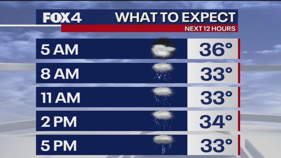 - 8 a.m.: Rain and a slight wintry mix arrive in DFW.