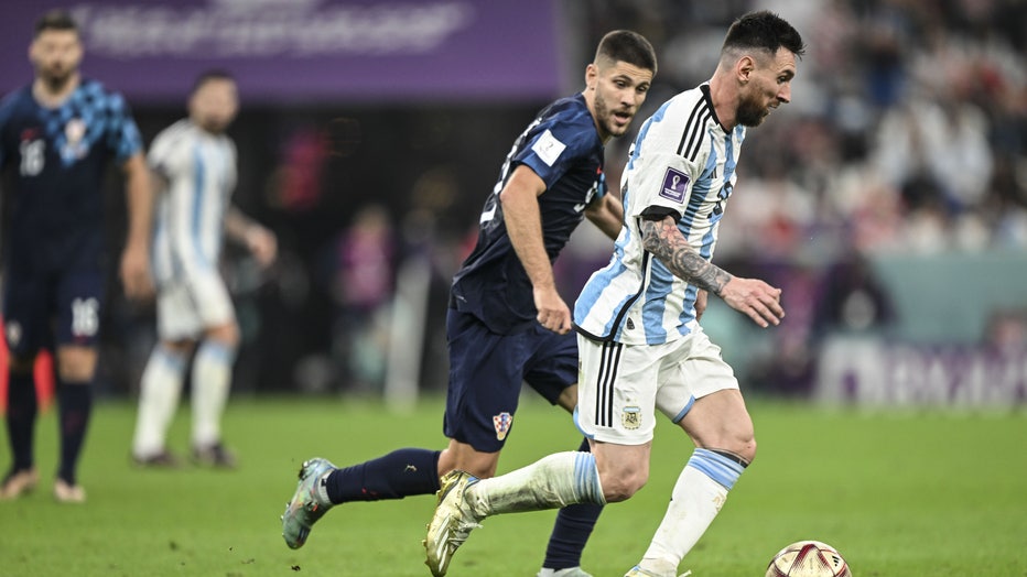 Lionel Messi (R) of Argentina in action during the FIFA World Cup Qatar 2022 Semi-Final match between Argentina and Croatia at Lusail Stadium on December 13, 2022, in Lusail City, Qatar. (Photo by Ercin Erturk/Anadolu Agency via Getty Images)