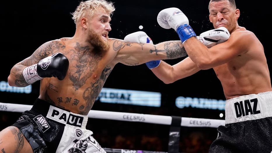 DALLAS, TEXAS - AUGUST 05: Jake Paul throws a left at Nate Diaz during the first round of their fight at the American Airlines Center on August 05, 2023 in Dallas, Texas. (Photo by Sam Hodde/Getty Images)