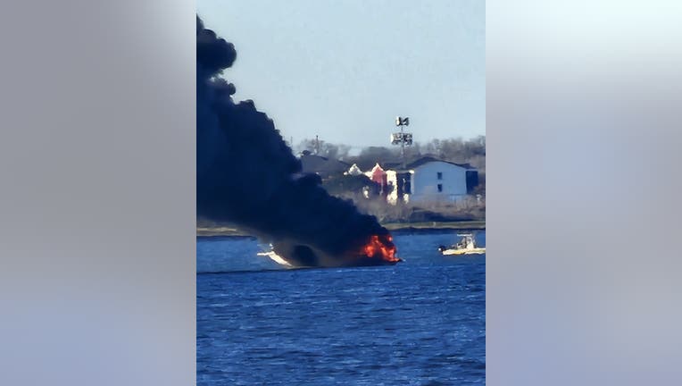 According to personnel at the scene, the boat had been operating with two people aboard when they heard a loud noise. The two on board said flames began coming through the floor of the boat.
