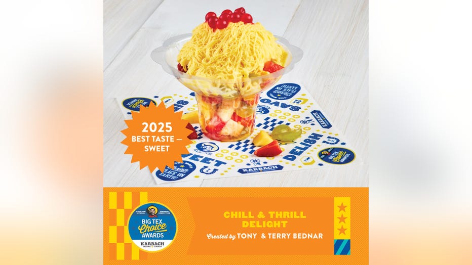 The Chill & Thrill Delight is a sweet treat that’s described as " a vibrant, refreshing twist on Colombia’s famous Salpicon de Frutas that is perfect for a warm day at the State Fair. A Texas-sized cup is packed with juicy, diced mango, pineapple, watermelon, grapes, cantaloupe, and strawberries, all soaked in fresh watermelon juice with a splash of lime. It’s topped with a handcrafted shaved mango sorbet that slowly melts into the mix for a sweet, tangy fusion. Whether you're cooling off or chasing bold flavors, this fruity treat is sure to thrill!"