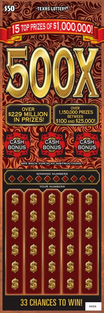 The overall odds of winning any prize in the 500X game are one in 3.36, one in 3.74 for the $1,000,000 Blitz game, and one in 3.49 for the X game.