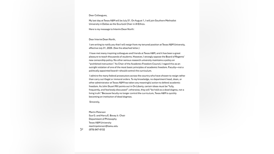 "But now we have a list of prohibited topics, things that we cannot teach," Peterson said in a Friday interview with FOX Local. "And then A&M cannot explain or motivate that in a reasonable way. No serious research university in the world has a list of prohibited topics that professors may not teach."