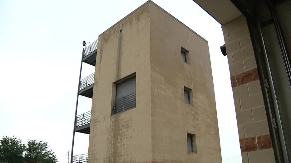 Perez climbed to the fourth level of the tower and began to lift up a fire hose.