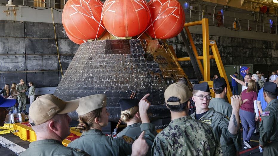 SAN DIEGO, CALIFORNIA - APRIL 11: The Artemis II Orion Capsule sits aboard the USS Murtha at Naval Base San Diego on April 11, 2026 in San Diego, California. The ten-day mission around the moon culminated in a successful splashdown off the coast of S