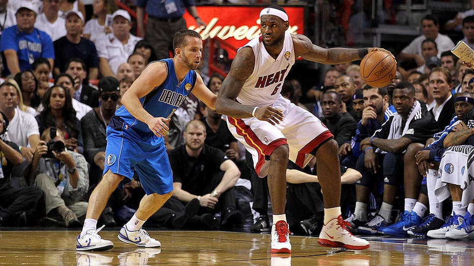 MIAMI, FL - JUNE 12: LeBron James #6 of the Miami Heat posts up against Jose Juan Barea #11 of the Dallas Mavericks in Game Six of the 2011 NBA Finals at American Airlines Arena on June 12, 2011 in Miami, Florida. The Mavericks won 105-95. NOTE TO US