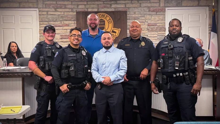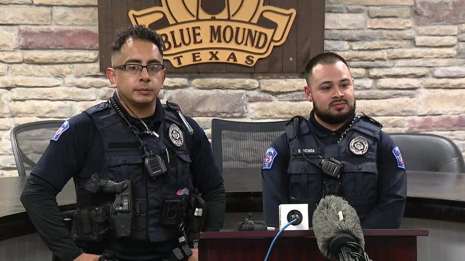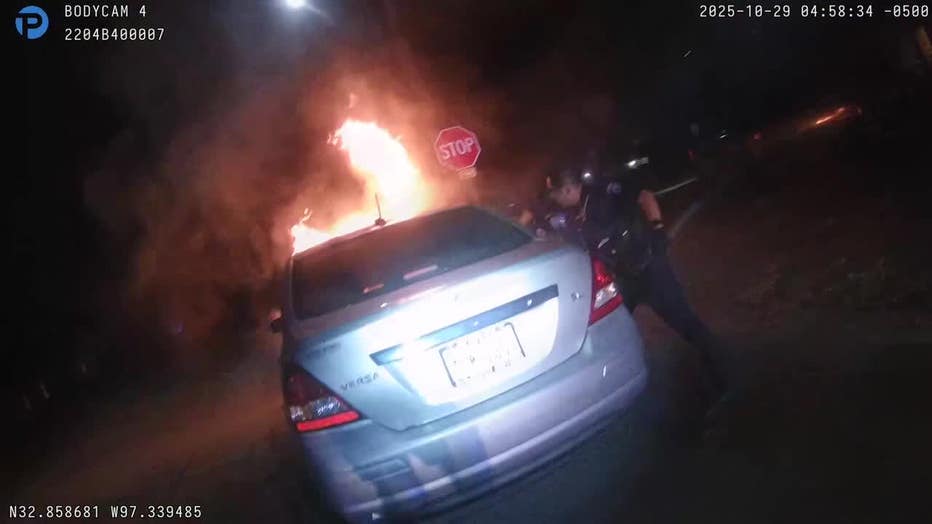 BLUE MOUND, Texas - Two Blue Mound police officers are being credited with saving a man’s life after pulling him from a burning car just minutes before it was fully engulfed in flames.