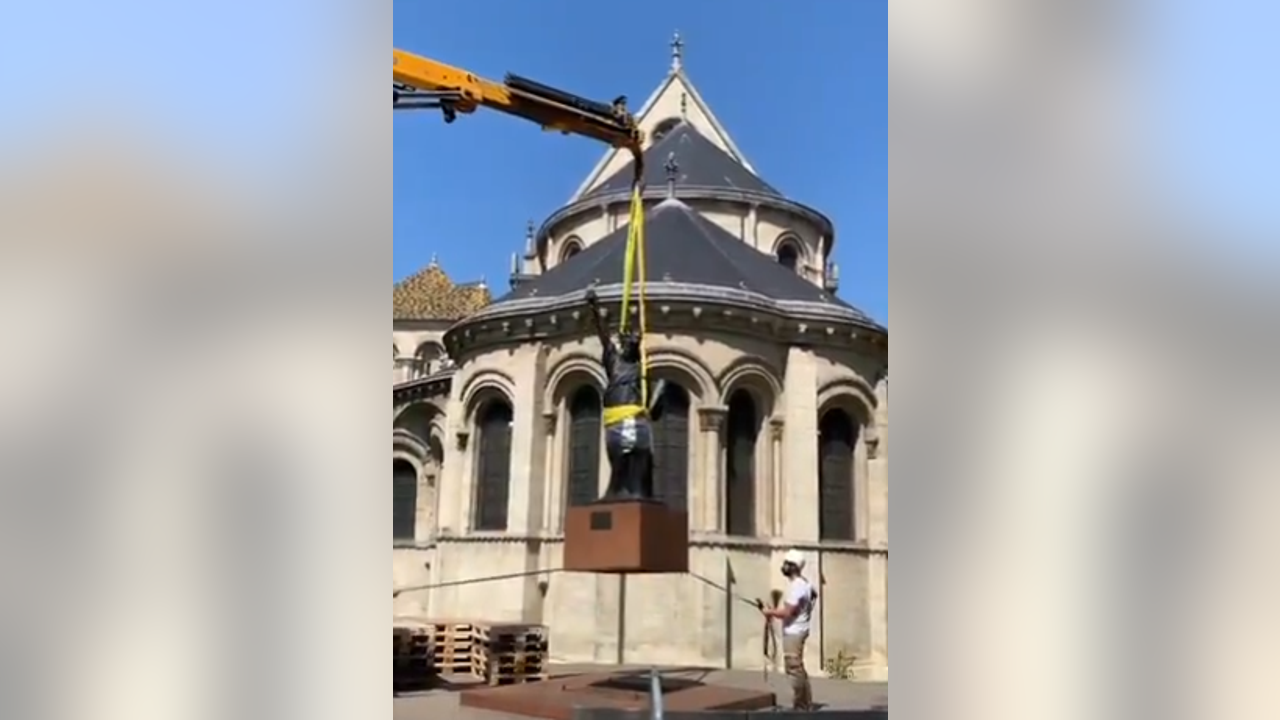 Video posted by the U.S. Embassy in France on June 8 shows the statue being picked up from in front of Paris’s National Conservatory of Arts and Crafts.