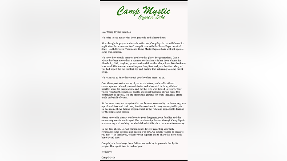 FOX Television Stations also obtained a copy of the letter Camp Mystic sent out to families regarding the withdrawal.