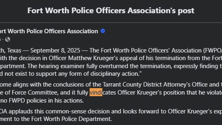 In a social media post, the union stated that the examiner found "cause did not exist to support any form of disciplinary action." The post added that the decision "fully vindicates Officer Krueger’s position that he violated no laws and no FWPD policies in his actions."