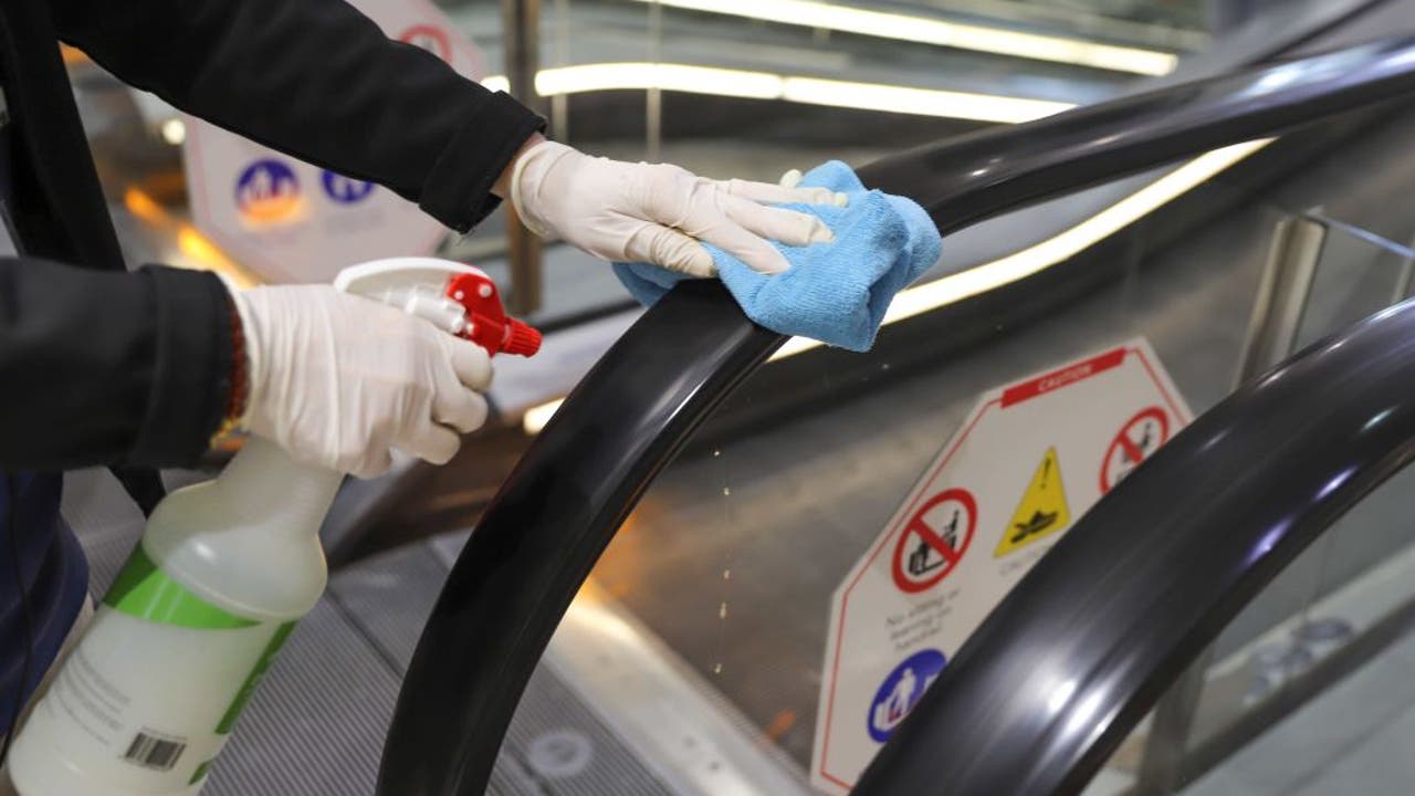 CANBERRA, May 16, 2020 -- Photo taken on May 16, 2020 shows a staff member cleaning the elevator handrail in Canberra, Australia. Australia has begun easing its coronavirus restrictions under the three-stage plan. From this weekend, cafes and restaur