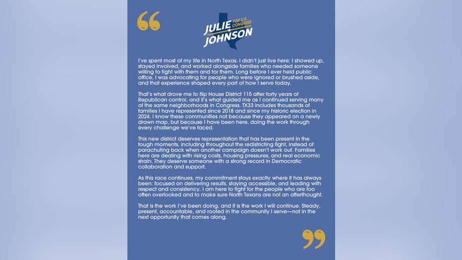 In a statement, Johnson said her commitment to her district will remain the same throughout this race. She plans to focus on "delivering results, staying accessible, and leading with respect and consistency."