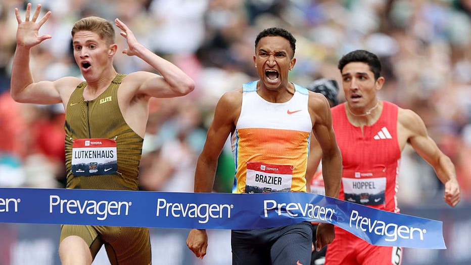 EUGENE, OREGON - AUGUST 03: Donavan Brazier wins the Prevagen Men's 800m final ahead of Cooper Lutkenhaus, who broke the U18 world record, and Bryce Hoppel during the 2025 USATF Outdoor Championships at Hayward Field on August 03, 2025 in Eugene, Ore