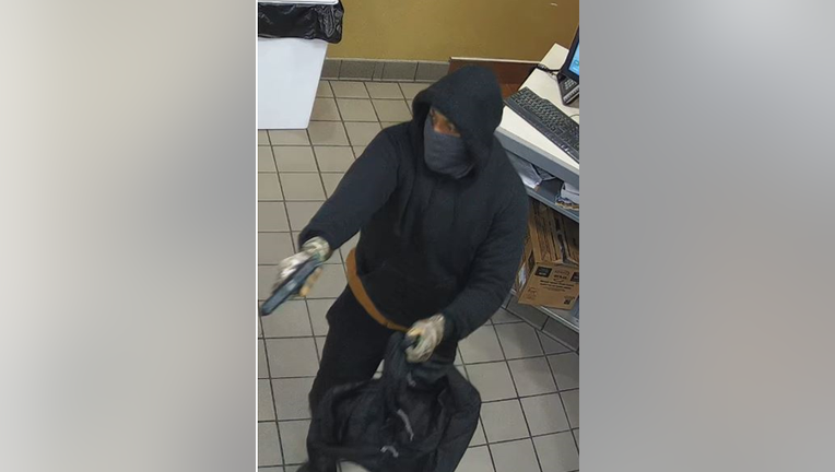 A surveillance photo shows him wearing a dark hoodie, dark pants, a face mask and gloves.