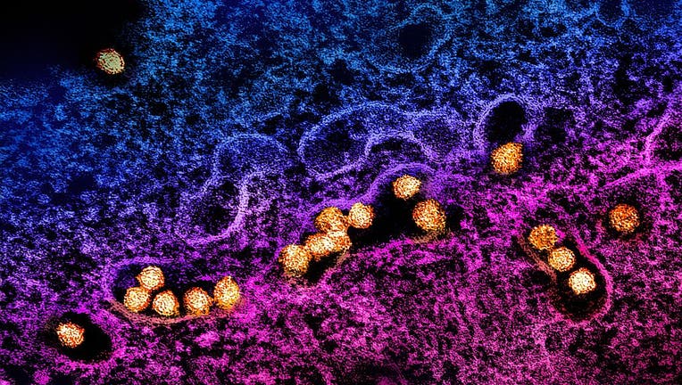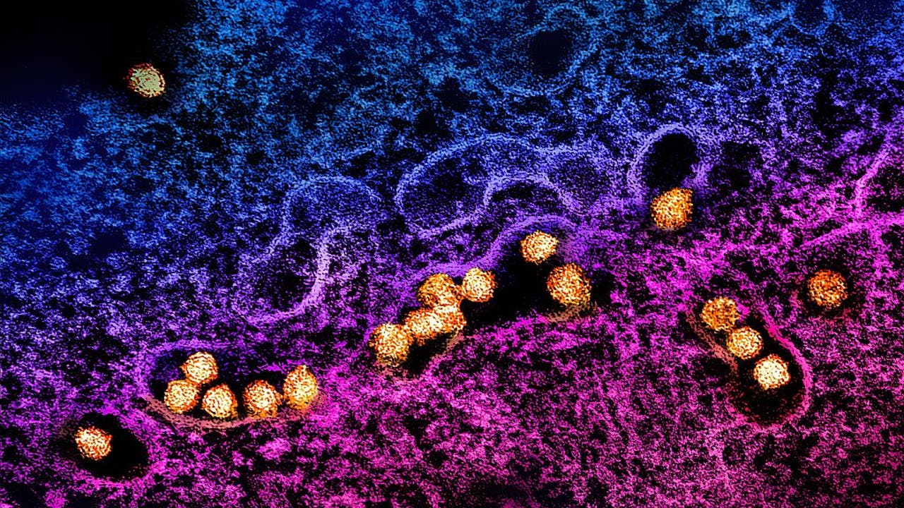 Transmission electron micrograph of West Nile virus particles (gold) replicating within the cytoplasm of an infected VERO E6 cell (pink/purple/blue). (Photo by: NIH-NIAID/Image Point FR/BSIP/Universal Images Group via Getty Images)