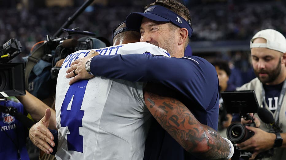 ARLINGTON, TEXAS - NOVEMBER 23: Dak Prescott #4 and Brian Schottenheimer of the Dallas Cowboys hug after the game against the Philadelphia Eagles in the game at AT&T Stadium on November 23, 2025 in Arlington, Texas. The Cowboys won 24-21. (Ph