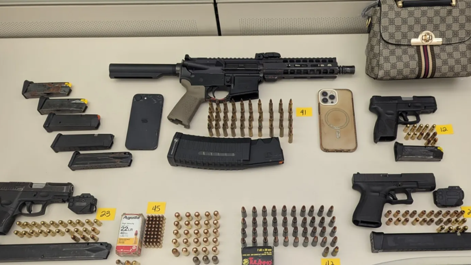During the search, officers seized a cache of weapons, including a short-barreled Radical Firearms AR-15 rifle with a 60-round magazine, a Glock pistol, and two Taurus pistols, all with varying magazines. Authorities also recovered 218 rounds of ammunition and a stolen purse connected to one of the robberies.