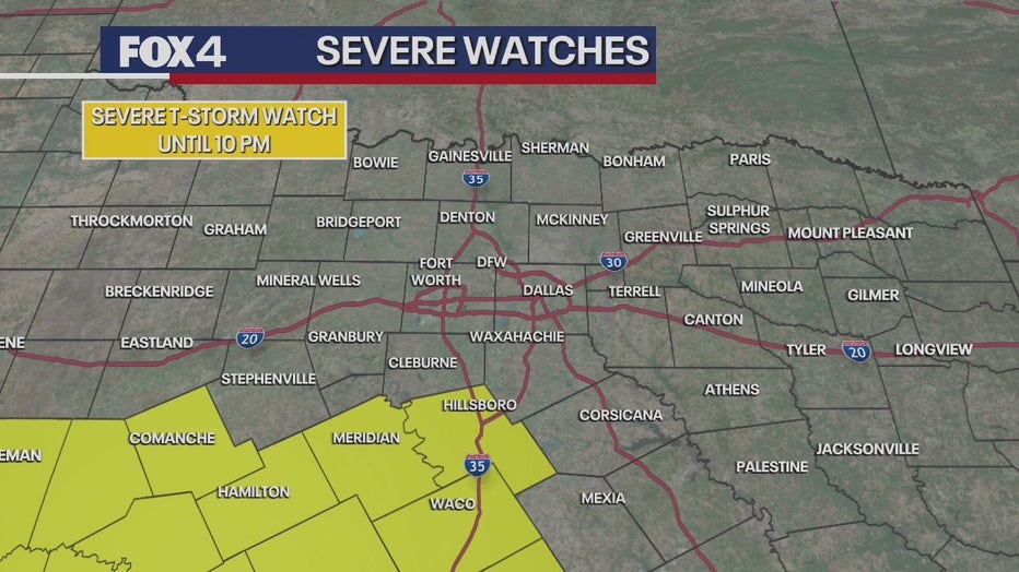 A Severe Thunderstorm Watch is in effect to the south and west of the DFW Metroplex until 10 p.m.
