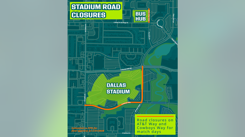 The sections of AT&T Way and Cowboys Way that border Dallas Stadium will be closed on match days.