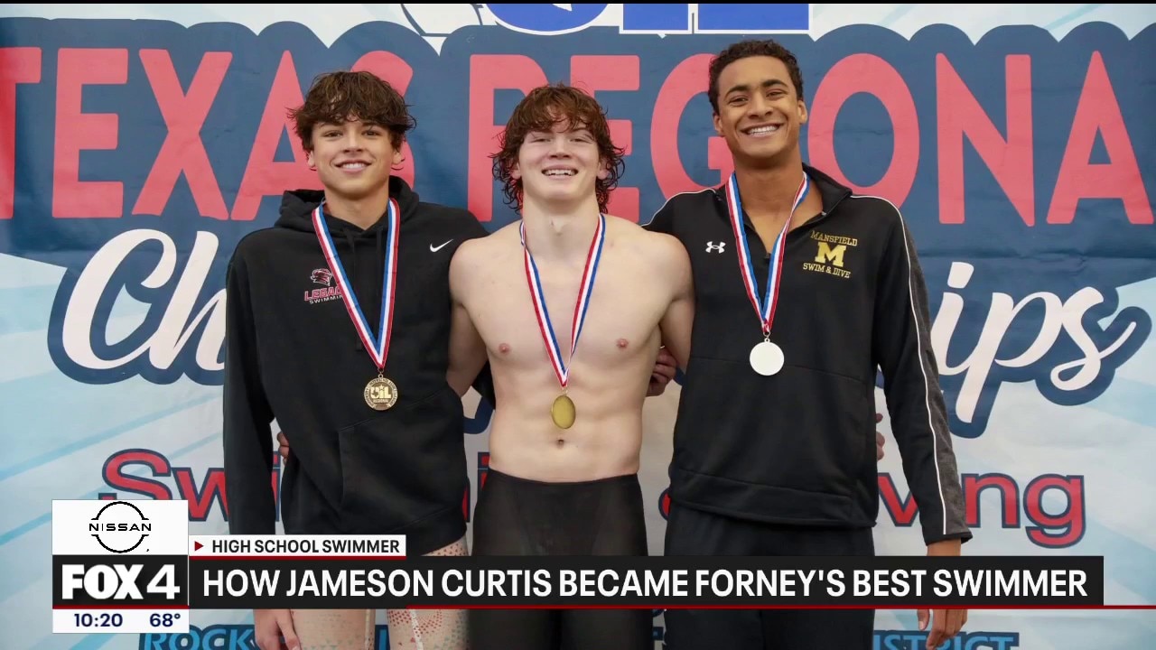 FORNEY, Texas - Jameson Curtis has never been one to back down from a challenge. As he stood at the edge of the Forney ISD Aquatics Center, the senior swimmer prepared for an unofficial world record attempt, wearing a football helmet.