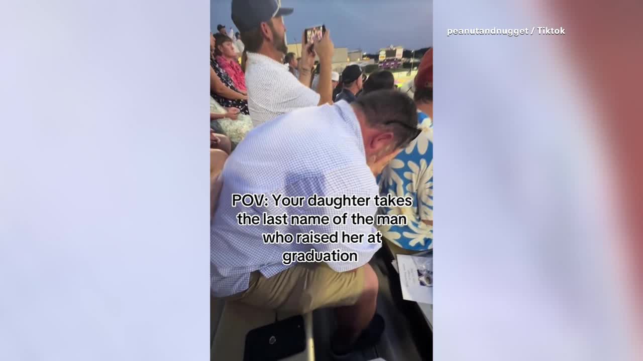 In a viral TikTok video with more than 16 million views, Sterling Dunagan honored the man she considers her father, Joey Leal. At her graduation, she had school leaders announce her name with his last name, Leal. The emotional video shows Leal breaking down in tears, falling to his knees as he hears her name announced.