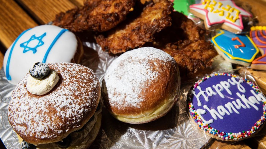 FILE - Donuts, latkes and Hanukkah themed cookies fill out a plate of Hanukkah treats at Grodzinski Bakery on Bathurst Street. (Nick Lachance/Toronto Star via Getty Images)