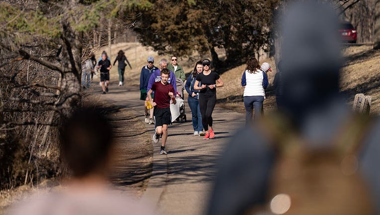 People enjoy the warm weather around Lake Harriet in Minneapolis, Minn. on Saturday, Mar. 21, 2026. (Photo by Alex Kormann/The Minnesota Star Tribune via Getty Images)