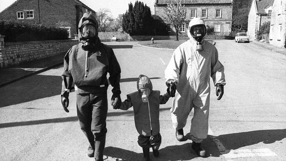 File: A family wearing anti-radiation suits in the village of Wellingore, Lincolnshire, the home of Civil Defence Supply, a mail-order business that supplies products to survive a nuclear attack, in 1980. (Photo by Ian Tyas/Keystone Features/Getty Im
