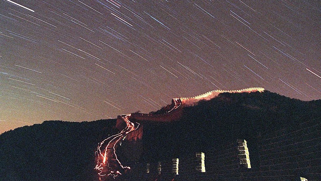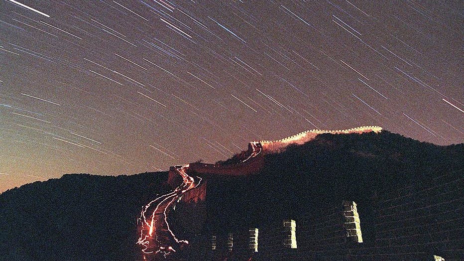 The Leonid meteor shower lights up the sky above China's Great Wall as stargazers brave the minus 20 degrees Celcius (minus 4 degrees Fahrenheit) temperature and walk up the wall with their flashlights 18 November in Badaling. (Photo credit: AFP PHOTO/Stephen SHAVER)