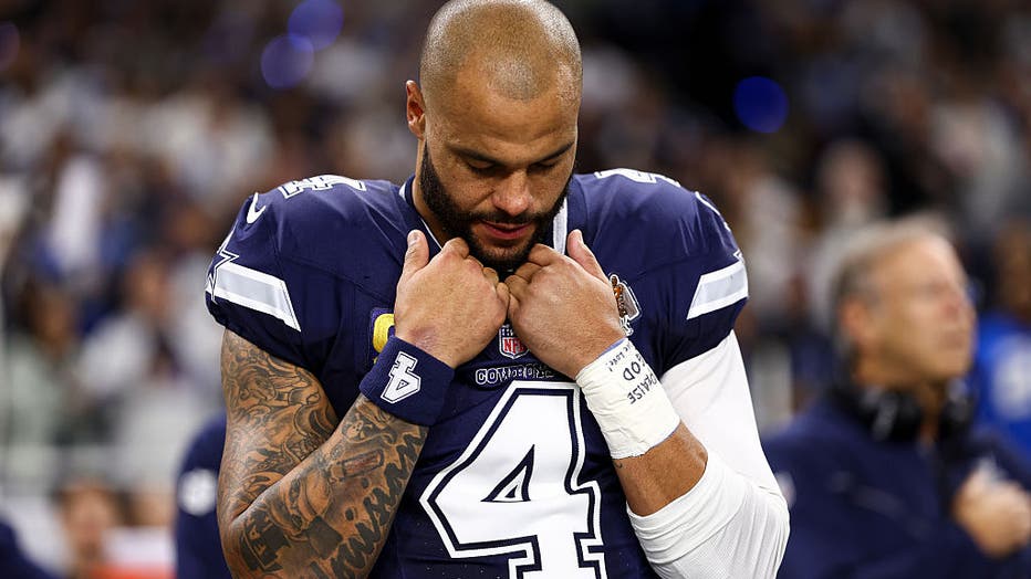 DETROIT, MICHIGAN - DECEMBER 4: Dak Prescott #4 of the Dallas Cowboys stands on the sidelines during the national anthem prior to the NFL football game against the Detroit Lions at Ford Field on December 4, 2025 in Detroit, Michigan. (Photo by Kevin