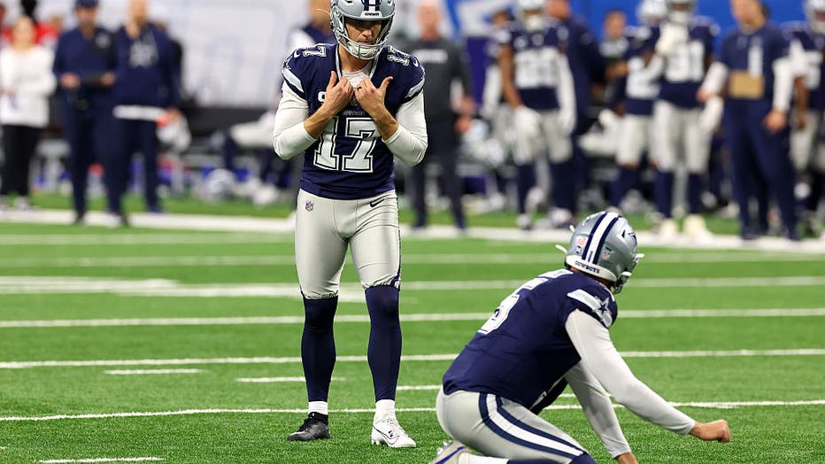 DETROIT, MICHIGAN - DECEMBER 04: Brandon Aubrey #17 of the Dallas Cowboys kicks a field goal against the Detroit Lions during the fourth quarter at Ford Field on December 04, 2025 in Detroit, Michigan. (Photo by Gregory Shamus/Getty Images)