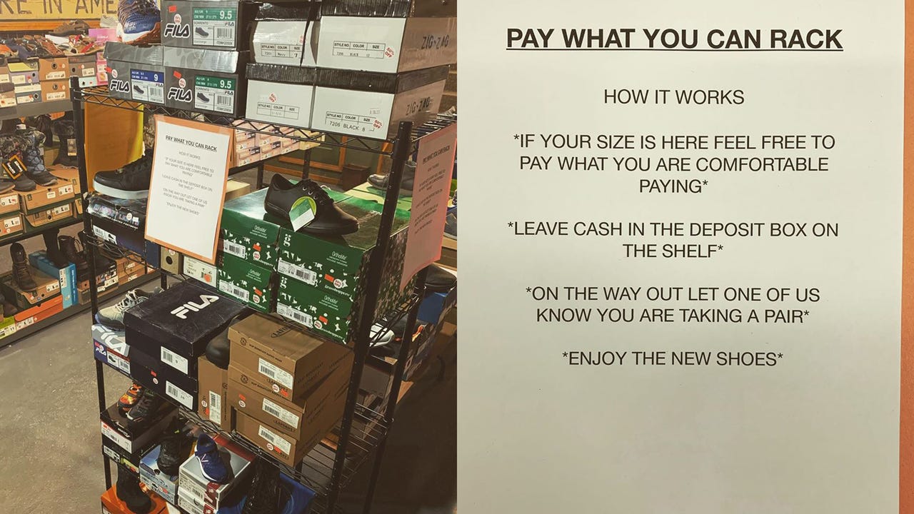 A shoe store in Maine is hoping to help customers facing hard times by offering a shoe rack in which people can pay whatever amount they choose.