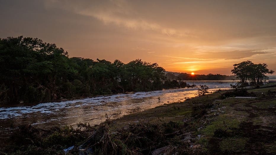 KERRVILLE, TEXAS - JULY 06: The sun sets over the Guadalupe River on July 06, 2025 in Kerrville, Texas. Heavy rainfall caused severe flooding along the Guadalupe River in central Texas, leaving more than 70 people reported dead. (Photo by Brandon Bel