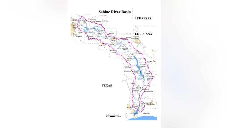 Forming the Texas-Louisiana border for much of its 578-mile length, the Sabine River broadens into Sabine Lake near its southern end before emptying into the Gulf.