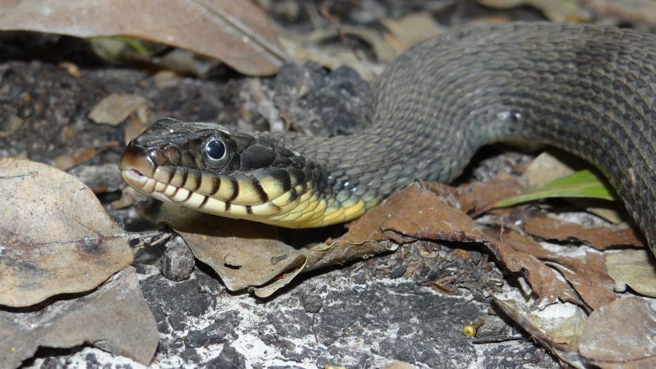Two common water snakes occur along its banks: the diamondback water snake and the blotched water snake. Diamondback water snakes are often nocturnal but may be active during the day in cooler seasons. Both species prefer slow-moving water, while blotched water snakes tend to remain near vegetated or overhanging banks for quick escape.