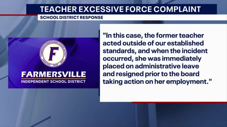 Farmsville ISD says the teacher acted outside the district’s established standard and was immediately suspended. The teacher quit before the board could make a decision on her employment. The district also alerted child protective services, the Texas Education Agency, and law enforcement after the incident occurred.