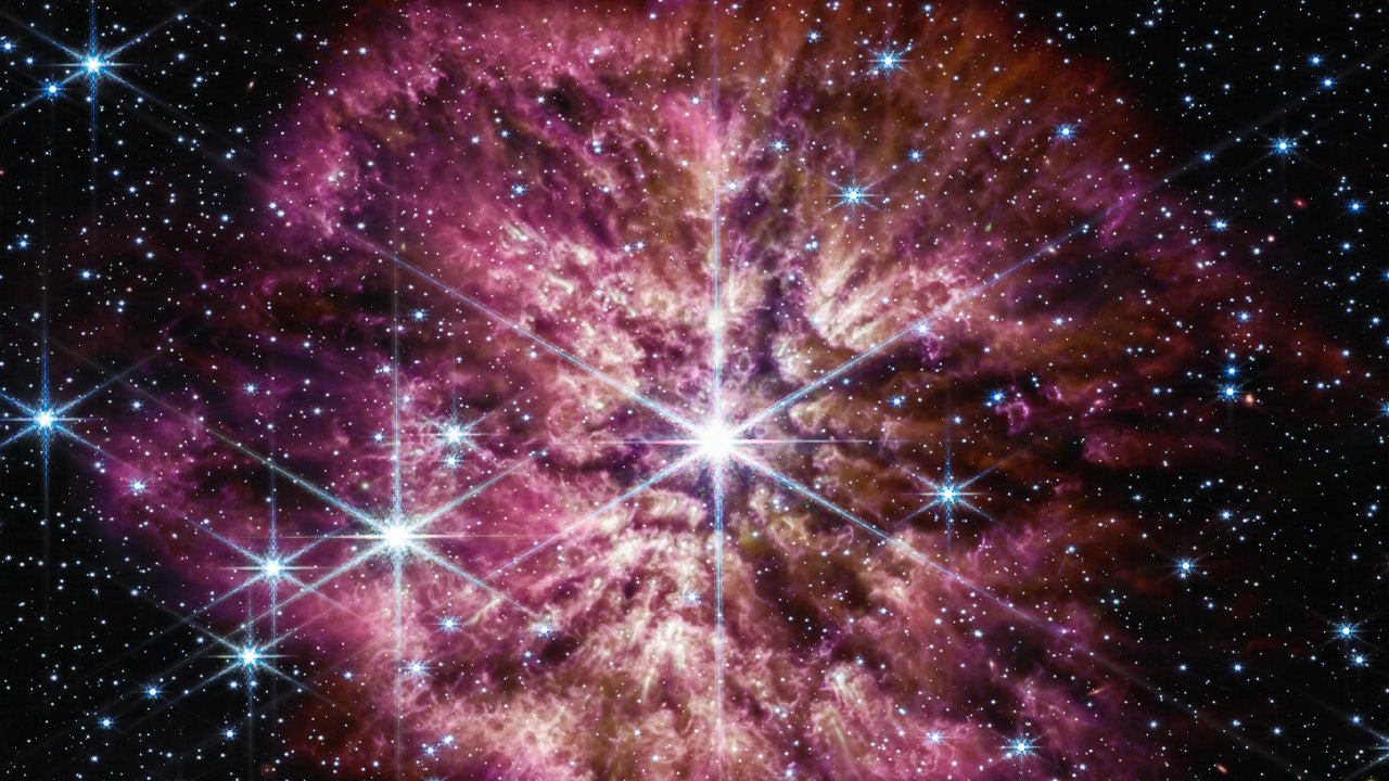 The luminous, hot star Wolf-Rayet 124 (WR 124) is prominent at the center of the James Webb Space Telescope’s composite image combining near-infrared and mid-infrared wavelengths of light from Webb’s Near-Infrared Camera and Mid-Infrared Instrument.C