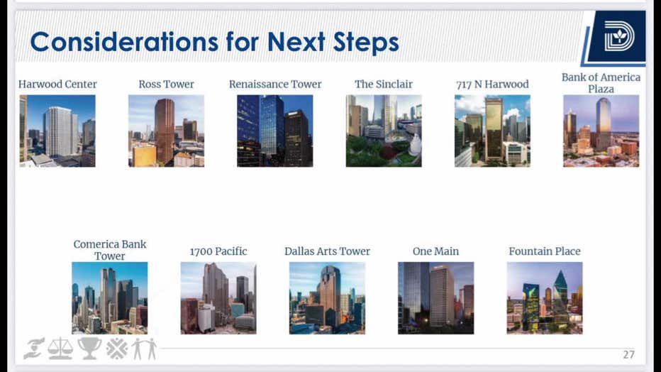 Within the city's presentation, a group of potential high-rise locations the city could potentially buy or rent. But the potential cost of moving was not stated, and any relocation would also require renovation to add a council chamber.