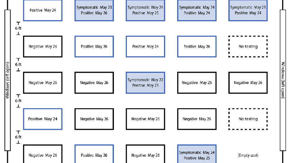 Classroom layout and seating chart for 24 students in index patient’s class, by SARS-CoV-2 testing date, result or status, and symptoms — Marin County, California, May–June 2021. Image: CDC