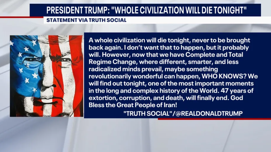 A U.S. ultimatum for Iran to reopen the Strait of Hormuz, which controls the flow of much of the world's oil and natural gas trade, was set for 7 p.m. CT Tuesday. Soon after, Trump posted his vague warning that appeared to hint at genocide if the demands were not met.