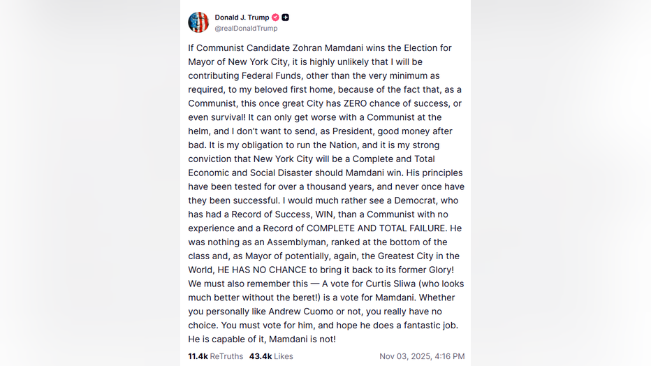 "It is my obligation to run the nation, and it is my strong conviction that New York City will be a complete and total economic and social disaster should Mamdani win," Trump wrote, adding that Mamdani, a former state assemblyman, was "nothing as an assemblyman."