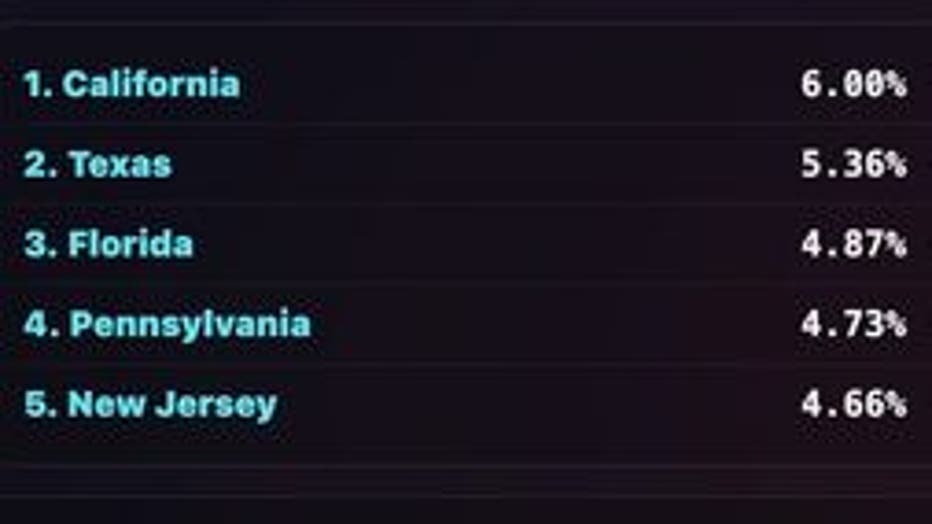Texas ranked No. 2 overall, with an implied bad-luck probability of 5.36%. California ranked first, followed by Texas, Florida, Pennsylvania and New Jersey to round out the top five.