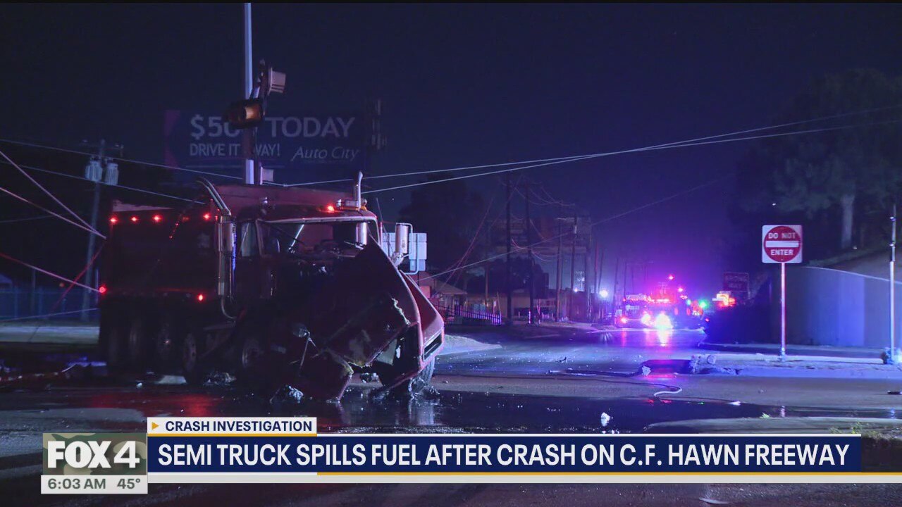DALLAS - The westbound lanes of U.S. Highway 175 (C.F. Hawn Freeway) remain closed Tuesday morning after a semi-trailer truck crashed into a utility pole late Monday, spilling diesel fuel and causing widespread power outages.