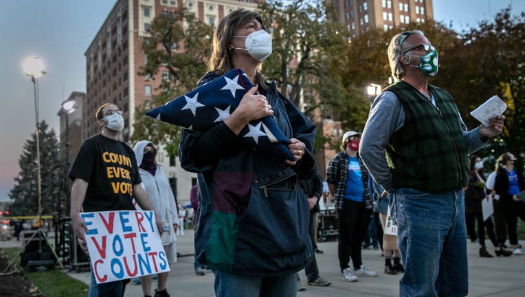 Protester Kristan Small carries a flag from her father's funeral while attending a fair election demonstration on November 04, 2020 in Lansing, Michigan.