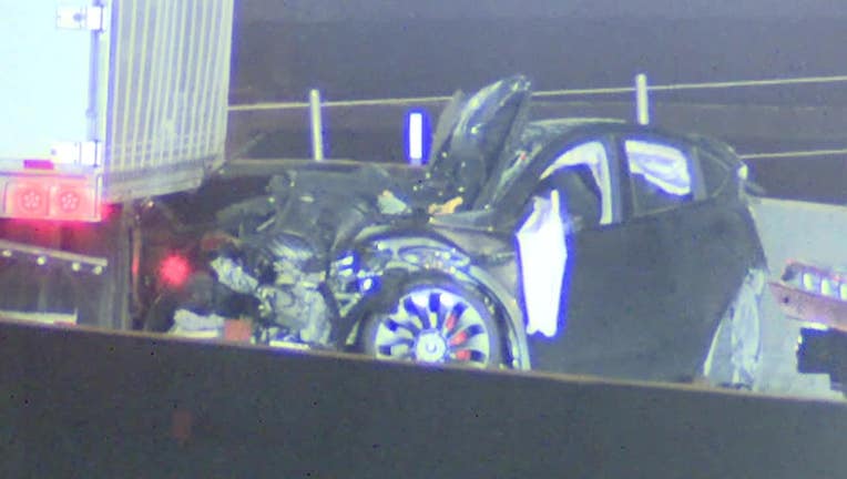 Police said the driver, who was traveling northbound in the southbound lanes, was pinned underneath one of the semi-trucks after the collision. Fire crews were required to extricate the driver, who was taken to the hospital with injuries believed to be non-life-threatening.