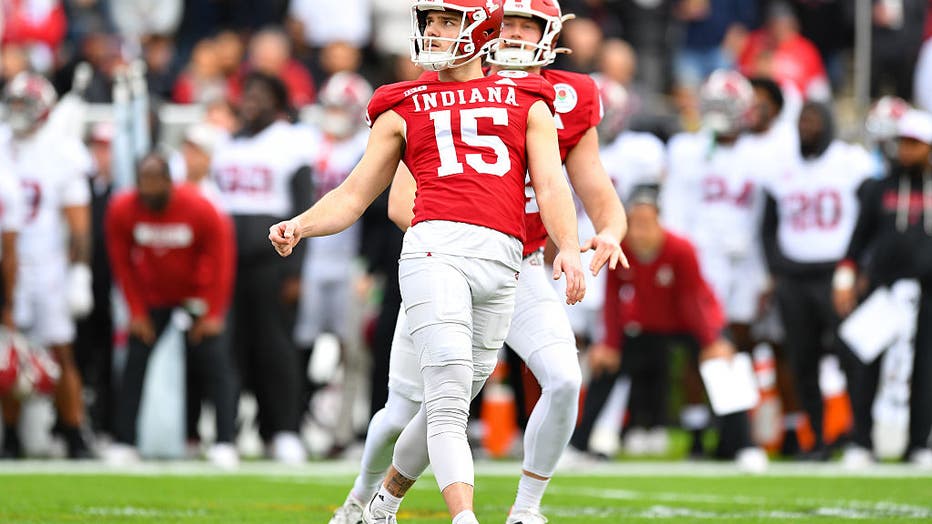 PASADENA, CA - JANUARY 01: K Nico Radicic #15 of the Indiana Hoosiers watches his kick during the Alabama Crimson Tide versus Indiana Hoosiers College Football Playoff Quarterfinal at the Rose Bowl Game on January 1, 2026, at the Rose Bowl Stadium in