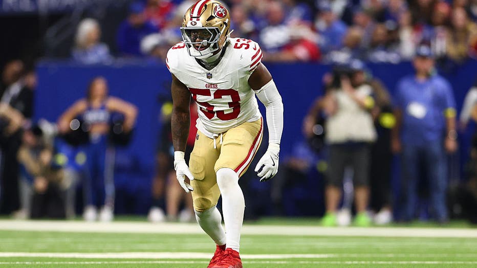 INDIANAPOLIS, INDIANA - DECEMBER 22: Dee Winters #53 of the San Francisco 49ers lines up before a play during an NFL football game against the Indianapolis Colts at Lucas Oil Stadium on December 22, 2025 in Indianapolis, Indiana. (Photo by Kevin Sabi