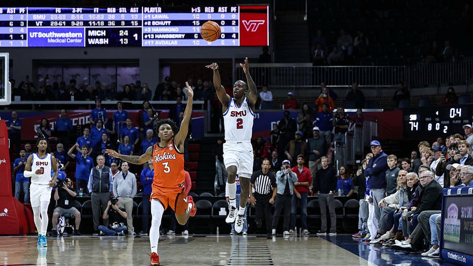 DALLAS, TX - JANUARY 14: SMU Mustangs guard Kevin "Boopie" Miller (#2) takes a last second half court shot to win the game during the ACC college basketball game between the SMU Mustangs and the Virginia Tech Hokies on January 14, 2026, at Moody Coli